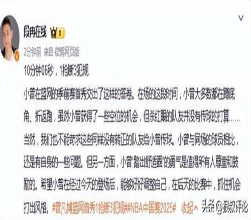 赛后,曾凡博10分钟未能获得出手机会引发外界的热议。
