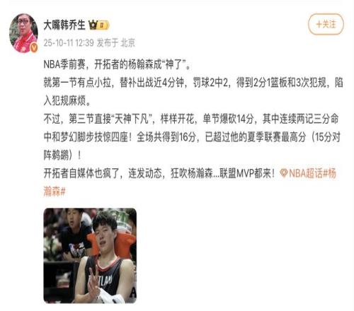 雷速体育10月11日宣 今天上午,杨瀚森在开拓者124-123击败国王的NBA季前赛中发挥出色,贡献16分、4个篮板和3次盖帽。著名媒体人韩乔生发文,称赞了杨瀚森的表现。