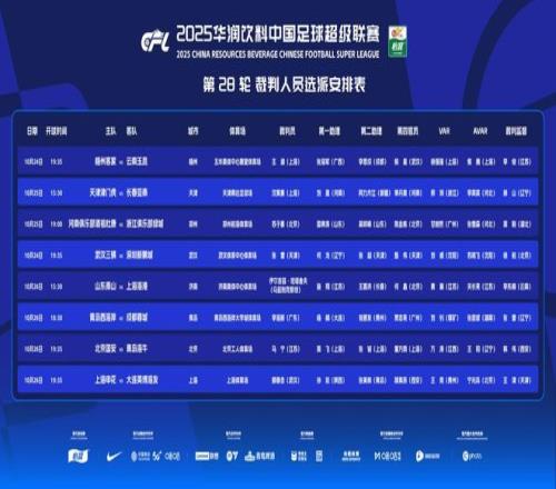 中超第28轮裁判安排