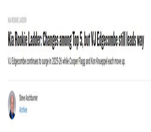 北京时间11月6日,NBA官方网站更新了新秀榜的排名。76人探花秀埃奇库姆继续排名第一。灰熊的11号秀考沃德也仍位列第二,他也是当初开拓者用于交易杨瀚森的筹码。状元弗拉格升至第三。以下是具体排名和解析——