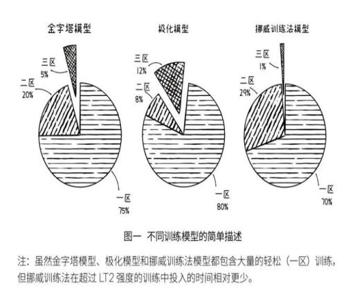 而更为独特的,是挪威训练法分配到三个区的训练量(图二),其中70%的跑量为轻松跑,象征性地用1%左右的跑量进行无氧阈值以上的超高强度训练,剩下的不到30%跑量留给有氧阈值和无氧阈值之间的混合区域。
