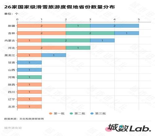 如果从文化和旅游部、国家体育总局先后认定的三批国家级滑雪旅游度假地来看,这26家“国字号”冰雪旅游目的地覆盖12个省份,其中吉林、新疆各占5席,数量为全国之首;黑龙江仅有2家,位列内蒙古、河北等省份之后。