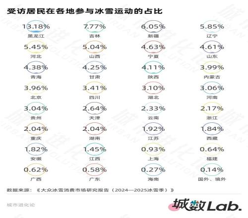 新赛季将至,来看看各地的实力如何?在国家体育总局冬季运动管理中心发布的《大众冰雪消费市场研究报告(2024—2025冰雪季)》中,黑龙江以13.18%的冰雪运动参与率位列全国首位,大幅领先排名其后两位的吉林(7.77%)和新疆(6.05%),且相比上个冰雪季吸引力进一步增强。