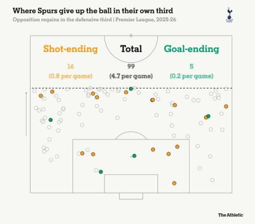 然而,2024-25赛季的一些不良习惯依然存在。他们已出现25次导致射门或失球的失误,照此趋势将超过去赛季的41次;他们场均在防守三区丢失球权4.7次,在联赛中仅好于维拉(5.2次)排名倒数第二;并且他们已因此类失误失球5次,与仅积7分排名英超垫底的狼队并列最多。