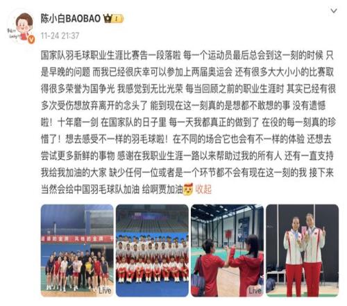 十五运会结束后,陈清晨宣布告别国家羽毛球队。当时她并没有透露自己的下一站会是哪里,而现在终于有了答案。